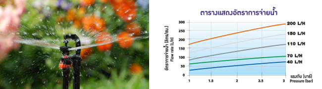 มีปริมาณน้ำให้เลือกตั้งแต่ 40 - 200 ลิตร/ชั่วโมง รัศมีฉีด 1.0 - 3.5 เมตร